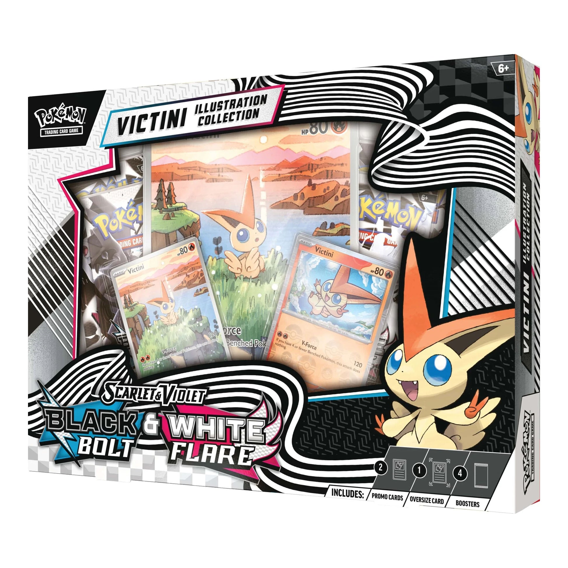 The Mythical Pokémon Victini is said to create infinite energy that it can share with its friends, and now you can team up with it in your own Pokémon TCG decks! In this collection, you get an illustration rare-style foil promo card and a premium parallel foil card featuring Victini, along with an oversize card for display. You’ll find even more Pokémon from the Unova region inside the included booster packs from the special Scarlet & Violet—Black Bolt and Scarlet & Violet—White Flare expansions.